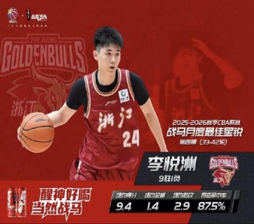 CBA官方寫道:恭喜浙江稠州籃球俱樂(lè)部球員李悅洲獲得2025-2026賽季CBA聯(lián)賽第4期月度最佳星銳球員!