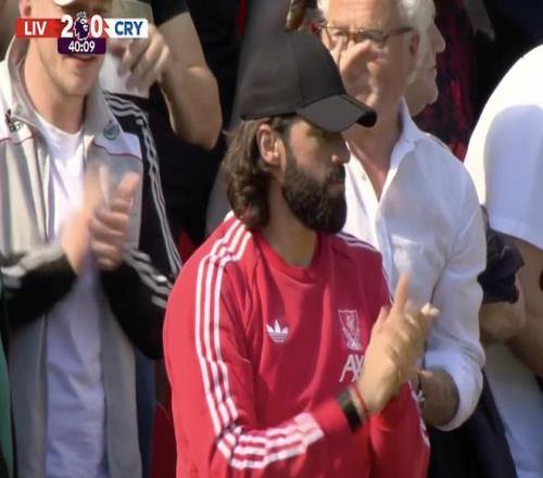 不過阿利松仍來到安菲爾德現(xiàn)場支持球隊(duì)。比賽第40分鐘,在第三門將伍德曼做出關(guān)鍵撲救后,利物浦通過一次快速反擊由羅伯遜取得進(jìn)球,轉(zhuǎn)播鏡頭隨即找到看臺上的阿利松,這位利物浦門將握拳歡呼,并為隊(duì)友們鼓掌。
