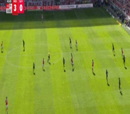 第45+2分鐘,半場(chǎng)3球落后,貝克爾補(bǔ)射破門,拜仁0-3美因茨