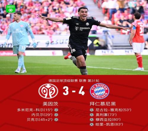 北京時(shí)間4月25日德國足球頂級(jí)聯(lián)賽 聯(lián)賽 第31輪,美因茨主場(chǎng)對(duì)陣拜仁慕尼黑。上半場(chǎng)佐耶海舟傳中,科爾凌空抽射破門,之后格雷羅中場(chǎng)丟球,之后的進(jìn)攻內(nèi)貝爾補(bǔ)射破門,半場(chǎng)補(bǔ)時(shí)階段貝克爾補(bǔ)射破門繼續(xù)擴(kuò)大比分。下半場(chǎng)默爾傳中,雅克松凌空抽射破門扳回一球,之后奧利塞內(nèi)切圓月彎刀再追一球,隨后穆西亞拉門前包抄破門扳平比分,緊接著穆西亞拉傳中被撲,凱恩補(bǔ)射破門反超比分。最終拜仁讓三追四4-3戰(zhàn)勝美因茨。