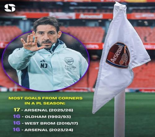 本賽季英超阿森納已通過角球打入17球,創(chuàng)造英超新的歷史紀(jì)錄