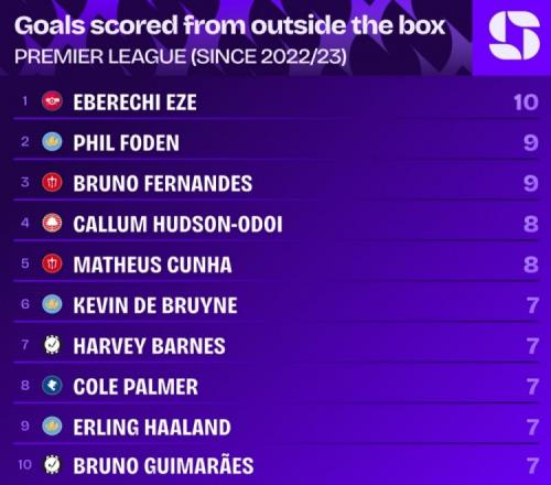 數(shù)據(jù)統(tǒng)計(jì)顯示,自2022-23賽季以來,埃澤已經(jīng)在禁區(qū)外打進(jìn)10粒進(jìn)球,比英超其他任何球員都更多。