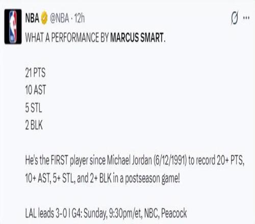此役斯瑪特成為1991年邁克爾-喬丹后首位季后賽20+10+5斷+2帽的球員,也是湖人隊史首位連續(xù)兩場比賽拿到20++5搶斷的球員,也是湖人隊史第二位單場21+10+5搶斷的球員比肩魔術(shù)師,拿著500萬的斯瑪特居然比肩了邁克爾-喬丹?