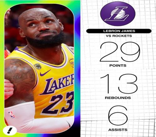 湖人首輪已經(jīng)3-0領(lǐng)先火箭,這場比賽41歲的勒布朗鏖戰(zhàn)45分鐘,22中10,三分9中4,罰球6中5,拿到29分13籃板6助攻3搶斷1蓋帽,命中率45.5%,三分命中率44.4%,真實命中率58.8%,美中不足是有8個失誤。
