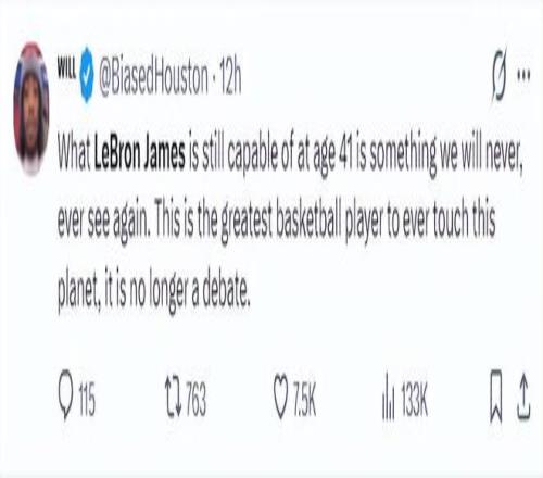 休媒Will都被詹姆斯打服了,他寫道:41歲的勒布朗在這個年紀依舊能展示非凡的水準,這是我們未來再也無法看到的了,他就是這個星球上最偉大的籃球運動員,這一點毋庸置疑。
