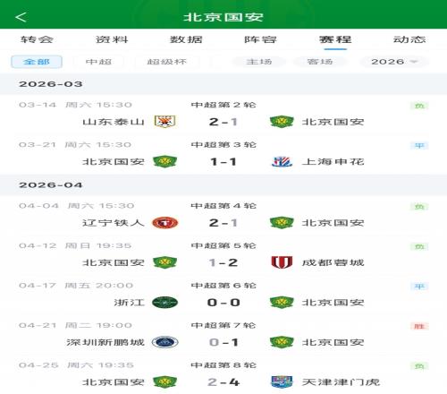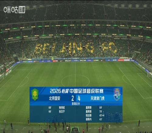 體育播報04月25日宣 中超第8輪,北京國安主場2-4不敵天津津門虎。近7輪僅1勝。
