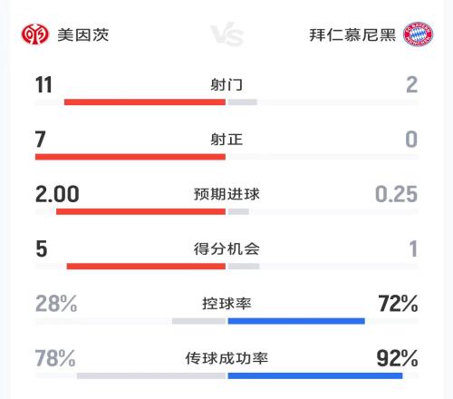 拜仁03美因茨半場數(shù)據(jù):射門211,射正07,控球率72%28%