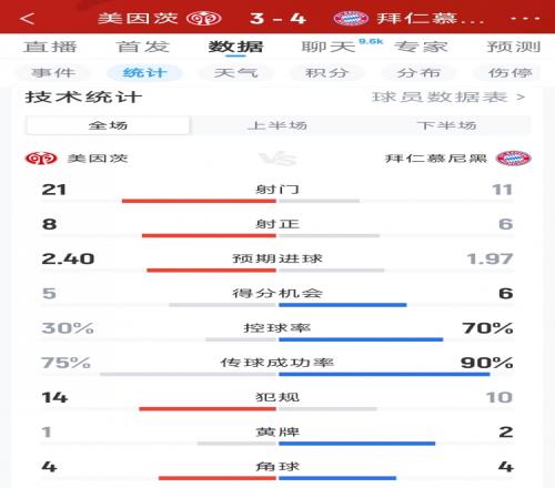 體育播報4月25日宣 在本輪德甲,拜仁3球落后完成大逆轉(zhuǎn),4-3戰(zhàn)勝美因茨,以下為雙方全場數(shù)據(jù)對比: