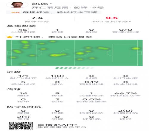 體育播報(bào)4月25日宣 在本輪德甲,拜仁4-3逆轉(zhuǎn)擊敗美因茨,凱恩替補(bǔ)登場(chǎng)破門(mén),以下為他在本場(chǎng)數(shù)據(jù):