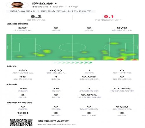 薩拉赫本場(chǎng)數(shù)據(jù):2過(guò)人成功1關(guān)鍵傳球+傷退,評(píng)分6.2