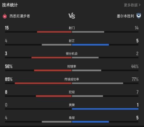 體育播報(bào)04月25日宣 澳超第26輪 西悉尼漫步者在主場聯(lián)邦銀行體育場迎戰(zhàn)墨爾本勝利,上半場雙方都未能完成破門場上比分0-0!下半場再戰(zhàn),第59分鐘主隊(duì)率先完成進(jìn)球但因越位被吹,第71分鐘,墨爾本勝利反擊完成進(jìn)球!補(bǔ)時(shí)階段墨爾本再次擴(kuò)大比分!最終全場比分定格0-2!