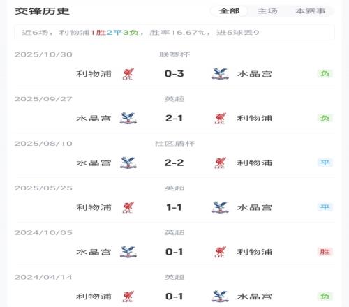目前英超積分榜上,利物浦16勝7平10負(fù)積55分,位列第5,少賽一場領(lǐng)先第6的布萊頓5分;水晶宮11勝10平11負(fù)積43分,位列第13,本賽季兩隊(duì)3次交手,利物浦全部輸球。