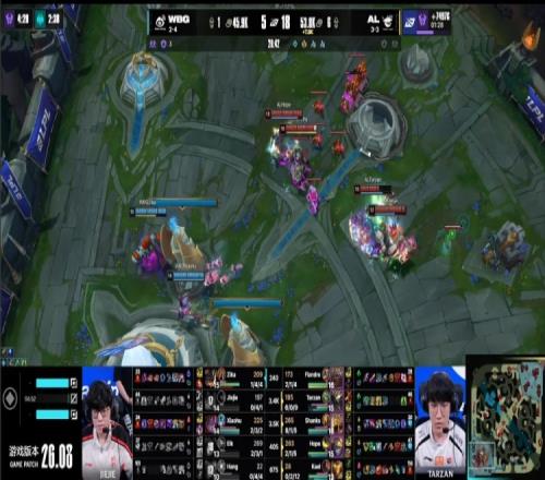 【24:32】AL中路推進(jìn)再殺xiaohu,AL回頭吃掉大龍,WBG四人接團(tuán)慘遭團(tuán)滅,AL打出1換5,后再打出0換4,一波推平WBG基地先下一城。