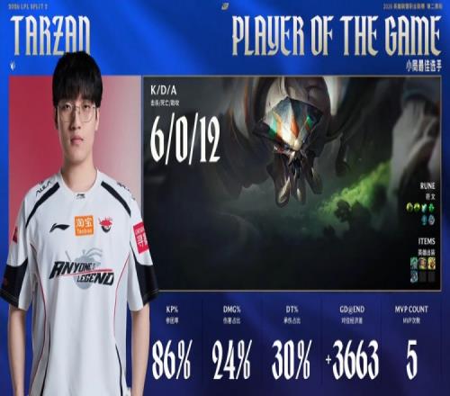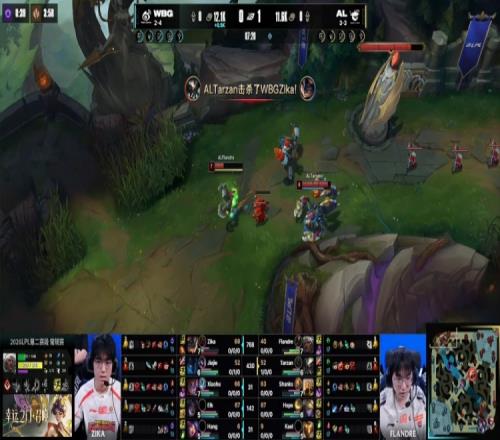 第一局前期Jiejie夢(mèng)魘入侵AL上野區(qū)送Tarzan蝎子一血,隨后Tarzan蝎子上路gank配合Flandre安蓓薩擊殺Zika蘭博,AL取得小優(yōu)勢(shì)。