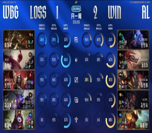 后期大龍團(tuán),Elk蕓阿娜轟掉Flandre雷克塞,Tarzan冥犬搶下大龍,Elk完成雙殺,Shanks卡牌追擊收掉Elk關(guān)鍵人頭,AL打出3換5,經(jīng)濟(jì)領(lǐng)先約3k。終極中路團(tuán)戰(zhàn),Elk蕓阿娜吃黃牌被控致死,Hang之坩堝嶄新如初,王杰盧錫安連續(xù)擊殺Elk與Jiejie完成雙殺,AL打出0換3,中路平推WBG基地贏得比賽勝利。