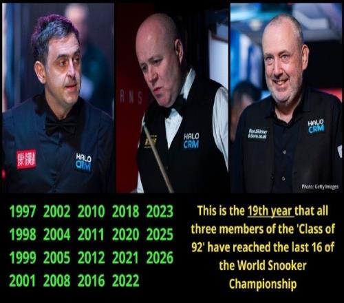 本次世錦賽,希金斯、奧沙利文、馬克·威廉姆斯全部晉級16強,據(jù)totalsnookered的統(tǒng)計,本次世錦賽是“75三杰”第19次同時晉級世錦賽16強。