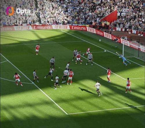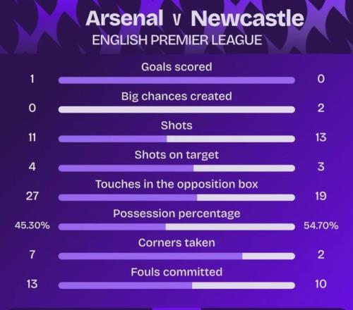 阿森納在射正次數(shù)、角球次數(shù)和對方禁區(qū)內觸球次數(shù)上領先,但紐卡斯爾在創(chuàng)造重大機會、射門數(shù)以及控球率上領先,這真的是一場非常接近的比賽。