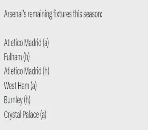 阿森納本賽季剩余比賽:客戰(zhàn)馬競、主戰(zhàn)富勒姆、主戰(zhàn)馬競、客戰(zhàn)西漢姆、主戰(zhàn)伯恩利、客戰(zhàn)水晶宮