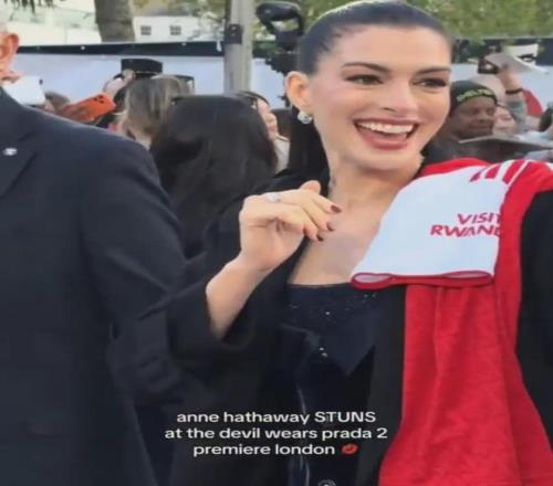 安妮-海瑟薇在出席《穿普拉達的女王2》倫敦首映禮時肩上搭了一件阿森納球衣。