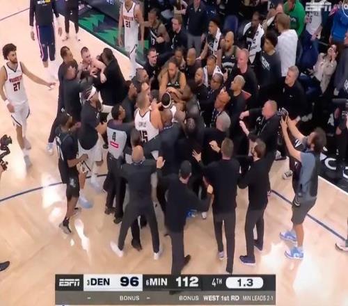 比賽最后階段,勝負(fù)已定,狼隊(duì)麥克丹尼爾斯完成了一次上籃,而此舉直接激怒了約基奇,后者直接從后場沖過去找麥克丹尼爾斯理論。隨后雙方?jīng)_突迅速升級,一旁的蘭德爾直接加入團(tuán)戰(zhàn),比賽場面瞬間亂成一團(tuán)。