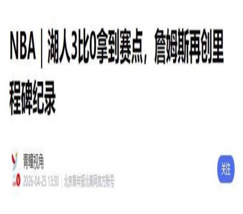 參考資料:青瞳視角2026-04-25 13:30《NBA|湖人3比0拿到賽點(diǎn),詹姆斯再創(chuàng)里程碑紀(jì)錄》