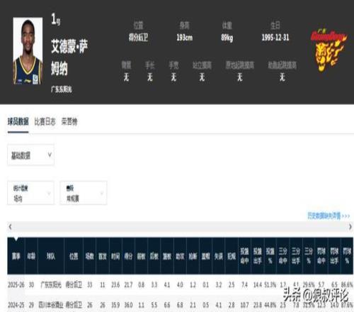 薩姆納本賽季代表廣東出戰(zhàn)33場比賽,場均23.6分鐘,得到21.7分4.1籃板4.0助攻,得分位居全隊(duì)第一。他在面對北京,上海等重要的對手,分別打出過良好的表現(xiàn),一旦沖起來,并沒有任何對手能在一對一當(dāng)中限制薩姆納。