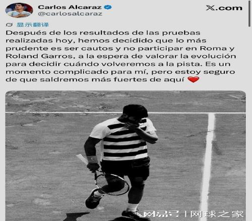 我們首先來(lái)關(guān)注阿爾卡拉斯。北京時(shí)間昨晚,阿卡通過(guò)個(gè)人社交媒體宣布,他因右手腕傷勢(shì)未愈,決定退出今年的法網(wǎng)衛(wèi)冕戰(zhàn)。 “在今天進(jìn)行的檢查結(jié)果之后,我們決定最穩(wěn)妥的做法是保持謹(jǐn)慎,不參加羅馬大師賽和羅蘭-加洛斯的賽事,等待評(píng)估進(jìn)展后再?zèng)Q定何時(shí)重返賽場(chǎng)。這對(duì)我來(lái)說(shuō)是個(gè)艱難的時(shí)刻,但我相信我們會(huì)從中變得更加強(qiáng)大?!?/p>