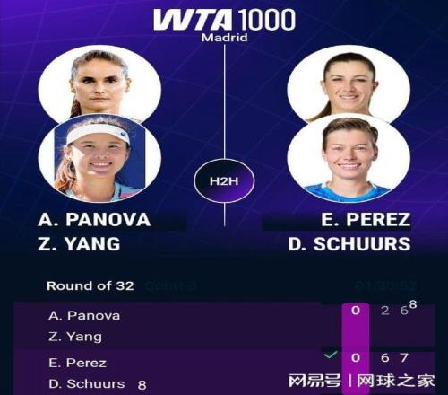 雙打賽場(chǎng):在首輪一場(chǎng)較量中,中俄組合楊釗煊/帕諾娃以2-6 6-7(8)不敵8號(hào)種子佩雷茲/舒爾斯,遭遇一輪游。