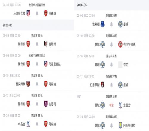 而在英超之外,曼城和阿森納都還要兼顧其他戰(zhàn)線。曼城已經(jīng)闖入足總杯決賽,將與切爾西vs利茲聯(lián)的勝者爭(zhēng)冠,阿森納則是要在歐冠半決賽兩戰(zhàn)馬競(jìng),爭(zhēng)奪歐冠決賽門票。
