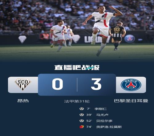 李剛?cè)蕚魃?,馬尤盧、貝拉爾多破門,貢薩洛·拉莫斯兩黃變一紅。巴黎聯(lián)賽兩連勝,以6分優(yōu)勢(shì)領(lǐng)跑法甲。
