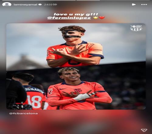 在本輪西甲巴薩對(duì)陣赫塔費(fèi)的比賽中,費(fèi)爾明首開記錄。費(fèi)爾明在進(jìn)球后也做出與亞馬爾同款慶祝動(dòng)作,向這位剛剛遭遇重傷的隊(duì)友致敬,亞馬爾也在個(gè)人社媒曬出兩人照片,配文寫道:“愛你,兄弟”