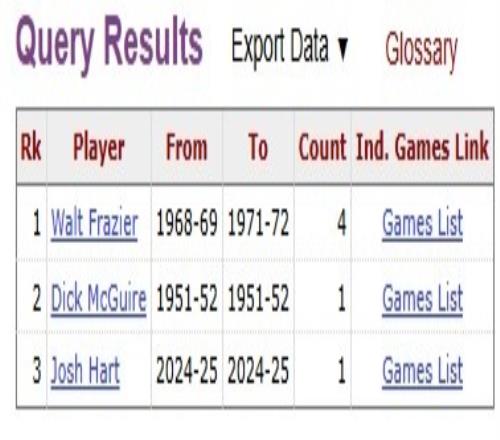 據(jù)統(tǒng)計,尼克斯隊史近50年來僅唐斯和哈特在季后賽砍下過三雙,榜單詳情如下:
