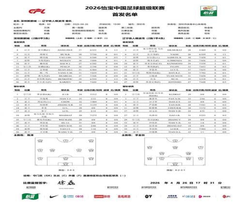 北京時(shí)間4月26日19:00,中超第8輪繼續(xù)進(jìn)行,深圳新鵬城坐鎮(zhèn)深圳市體育中心體育場(chǎng)迎戰(zhàn)遼寧鐵人,本場(chǎng)主裁判為萬濤,VAR裁判為何鑫,賽前雙方首發(fā)出爐。