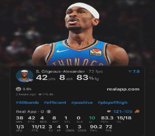 G3大戰(zhàn),亞歷山大投籃18中15,以高達(dá)約83%命中率狂轟42分4板8助,帶領(lǐng)雷霆客場(chǎng)121-109擊敗太陽(yáng),目前系列賽3-0大比分領(lǐng)先已拿到賽點(diǎn)。