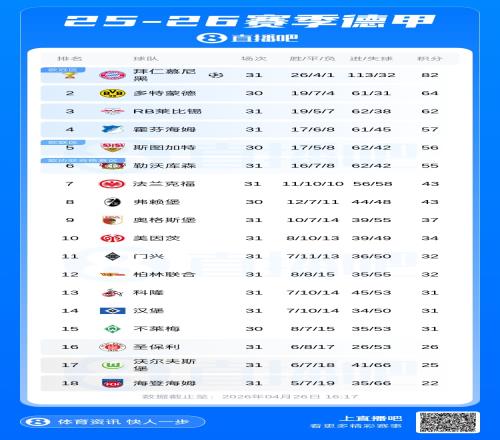 體育播報(bào)04月26日宣 德甲第31輪,沃爾夫斯堡0-0戰(zhàn)平門興,近14輪聯(lián)賽僅取得一場勝利,繼續(xù)排名德甲倒數(shù)第二。