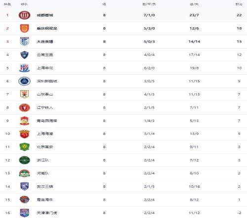 在積分榜上,成都蓉城排名榜首,戰(zhàn)績是7勝1平,拿到22分。重慶銅梁龍戰(zhàn)平之后,總積分是18分,排名第2。大連英博輸球之后,依然是15分,排名第3。云南玉昆4勝4負,拿到12分,排名第4。上海申花贏球之后,總積分是10分,升到了第5的位置。被扣掉10分的情況下,上海申花能夠這么快爬到這樣的位置,非常不容易。上海海港5分,排名第10。北京國安3分,排第11。浙江隊也是3分,排名第12。