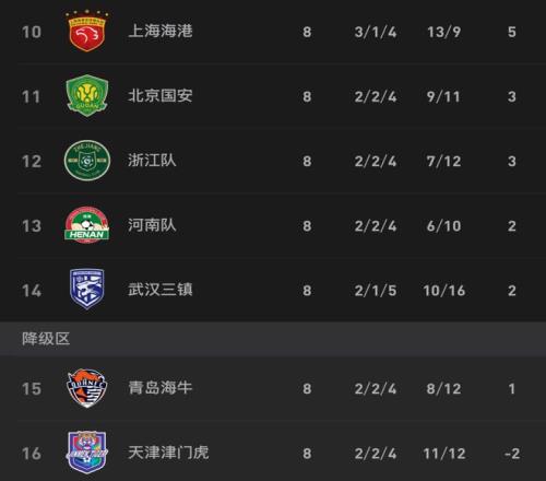 而與申花相比,另外兩支老牌勁旅國(guó)安和泰山則爆冷翻車,他們分別給積分榜最后2名津門虎和海?!八蜏嘏薄?br/>海牛更是憑借4-1大勝泰山的關(guān)鍵3分,成功在本輪過后積分轉(zhuǎn)正。而津門虎在本輪客場(chǎng)4-2力挫國(guó)安后,已經(jīng)有望在下輪擺脫負(fù)分的困境。