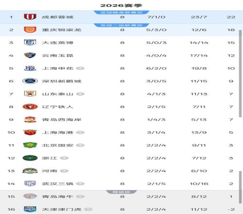 北京時(shí)間4月26日,隨著第二個(gè)比賽日5場比賽順利進(jìn)行,2026賽季中超聯(lián)賽第8輪比賽全部結(jié)束。8輪過后的積分榜,前5的球隊(duì)積分全部上雙,上海申花落后榜首的成都蓉城12分,僅剩下最后1支球隊(duì)積分是負(fù)分。