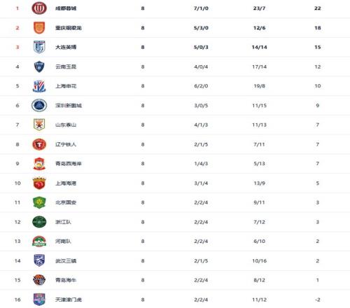 前8輪之后,成都蓉城、重慶銅梁龍、上海申花保持不敗。成都蓉城以22分排名榜首,重慶銅梁龍以18分排名第二位,申花則以10分排名第5位。