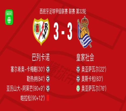 北京時(shí)間4月26日西班牙足球甲級(jí)聯(lián)賽 聯(lián)賽 第32輪,巴列卡諾主場(chǎng)對(duì)陣皇家社會(huì)。巴列卡諾塞爾希奧-卡梅略破門,勒熱納破門,亞歷山大-阿萊芒破門。皇家社會(huì)奧亞薩瓦爾梅開二度,奧斯卡松破門。最終比分巴列卡諾 3-3 皇家社會(huì)。