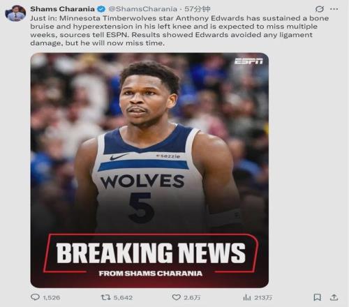 北京時(shí)間4月27日凌晨,據(jù)NBA名記Shams報(bào)道,愛德華茲確診左膝骨挫傷和過度伸展,將缺席數(shù)周!森林狼和掘金的系列賽最晚5月3日結(jié)束(G7),也就是一周之后,華子肯定趕不上了。另一個森林狼球員迪溫琴佐,因跟腱撕裂賽季報(bào)銷。