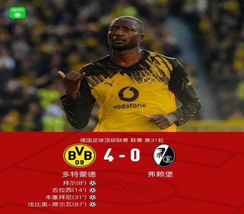 北京時(shí)間4月26日德國(guó)足球頂級(jí)聯(lián)賽第31輪,多特蒙德主場(chǎng)對(duì)陣弗賴(lài)堡。上半場(chǎng),本塞拜尼長(zhǎng)傳,拜爾破門(mén)。布蘭特傳中,吉拉西建功。瑞爾森開(kāi)出角球,本塞拜尼頭槌得分。下半場(chǎng),法比奧-席爾瓦破門(mén)。全場(chǎng)比賽結(jié)束,多特4-0輕取弗賴(lài)堡,結(jié)束兩連敗。