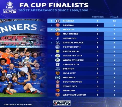 自9900賽季參加足總杯決賽次數(shù)榜:切爾西12次居首,曼城7次第三
