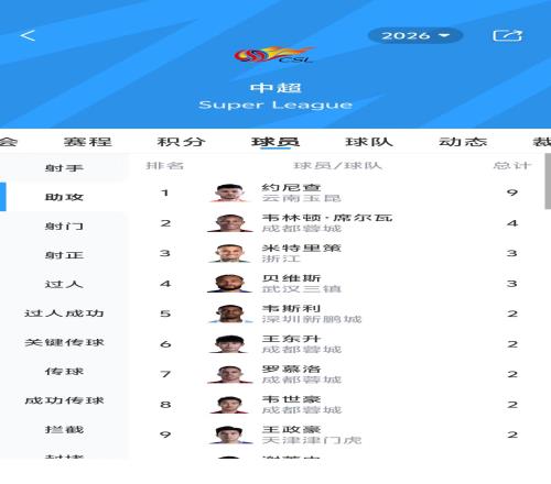 上賽季中超助攻王克雷桑27場(chǎng)貢獻(xiàn)9次助攻,納薩里奧29場(chǎng)貢獻(xiàn)9次助攻。本場(chǎng)比賽結(jié)束,約尼查已追平上賽季的助攻記錄。