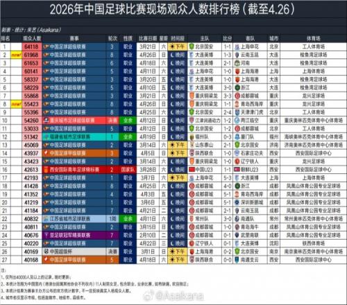 體育播報4月26日宣 《轉(zhuǎn)會市場》中國區(qū)管理員朱藝更新了2026年中國足球現(xiàn)場觀眾排行榜,其中本輪三場中超聯(lián)賽進(jìn)入前十。