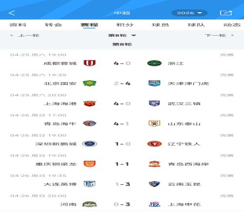 體育播報(bào)04月26日宣 中超第8輪結(jié)束,成都蓉城4分領(lǐng)跑中超,重慶銅梁龍不敗第2,上海申花升至第5,隨著青島海牛積分轉(zhuǎn)正,只剩天津津門虎一支負(fù)分球隊(duì)。