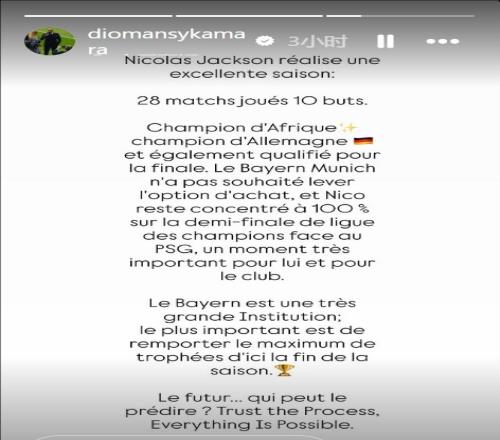 “他是非洲冠軍、德甲冠軍,并且同樣獲得了進(jìn)入決賽的資格(德國杯)。拜仁慕尼黑目前并無意愿執(zhí)行買斷條款,但尼科(杰克遜)本人正100%專注于對陣巴黎圣日耳曼的歐冠半決賽,這對球員及其俱樂部而言都是極其重要的時刻?!?/p>