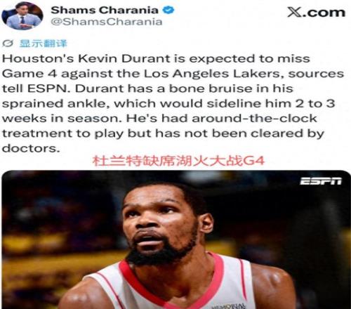 北京時間4月27日,NBA季后賽西部首輪G4,火箭主場迎戰(zhàn)湖人,這是一場不折不扣的生死戰(zhàn)——輸球即被淘汰。可就在賽前,NBA名記Shams帶來重磅壞消息:杜蘭特繼續(xù)缺席,且傷情棘手,短時間內(nèi)難以復(fù)出。