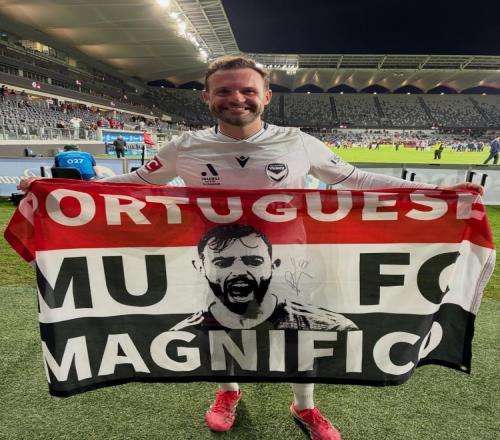 B費本賽季表現(xiàn)出色,有望競爭英超年度最佳球員獎項,馬塔在球場上舉起為B費加油的旗幟,上面寫有“葡萄牙人、曼聯(lián)、太出色了”字樣,以及B費的頭像。