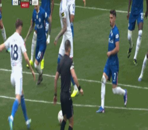 15’ 利茲聯傳切配合撕穿藍軍防線,阿倫森的單刀打門被桑切斯用腳擋出底線;